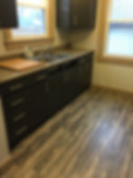 ¾" thick boards and stops for entire area - $18 Mistint paint for the trim - $9 Then, the cabinets - OMG. We pulled that awful trim off, removed the tiny nails, and filled them with wood filler. Then a MAJOR sanding effort. The sanding took off the varnish, the dated finish, and left us with bare wood. The outsides got one color, the insides a lighter shade, and all shelves were finished off with new contact paper. New hardware finished off the gorgeous new look!